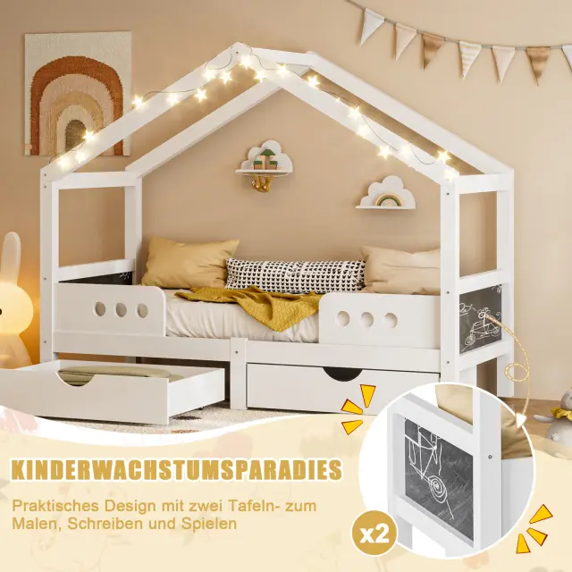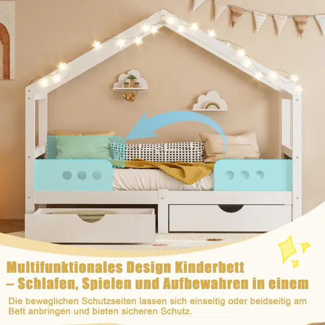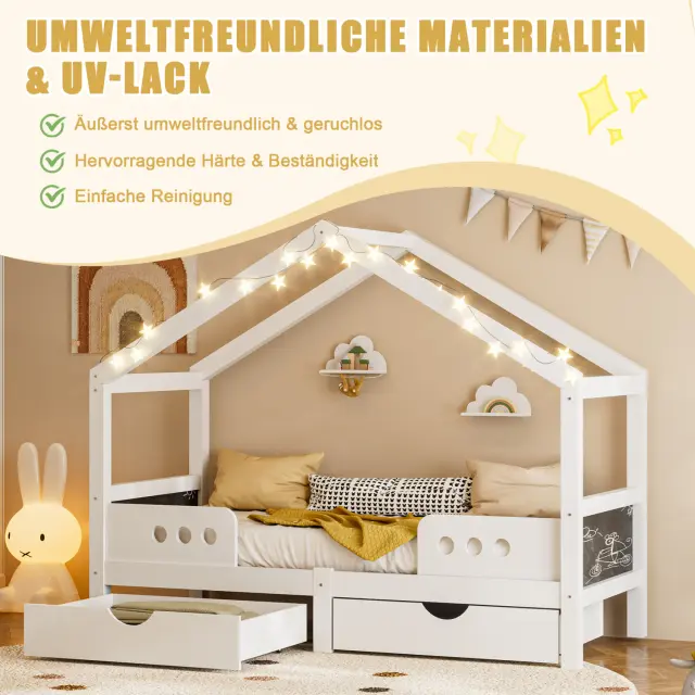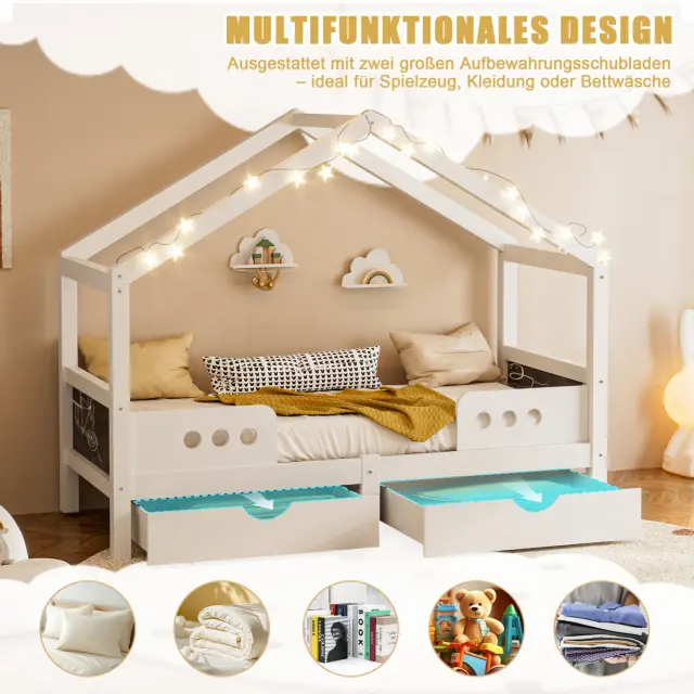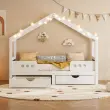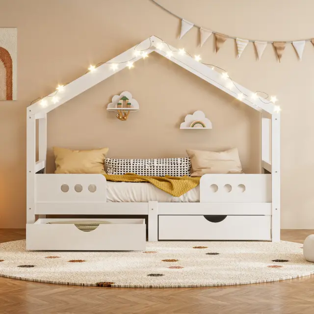 Otroška postelja s streho, 2 predala, les+MDF, UV lak, do 120 kg, 90x200 cm