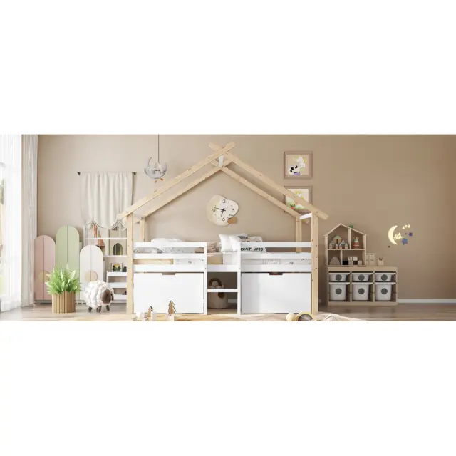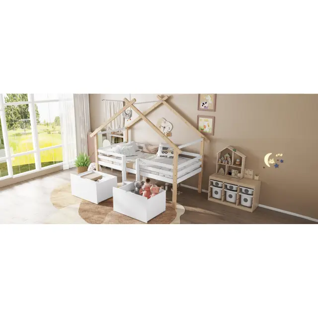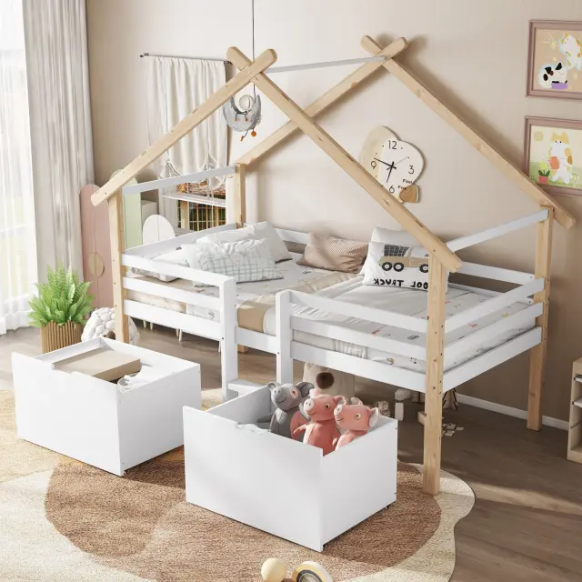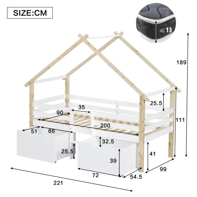 Otroška postelja s streho, stopnicami in ograjo, 90x200 cm, bor/MDF, bela/naravna