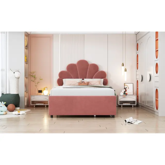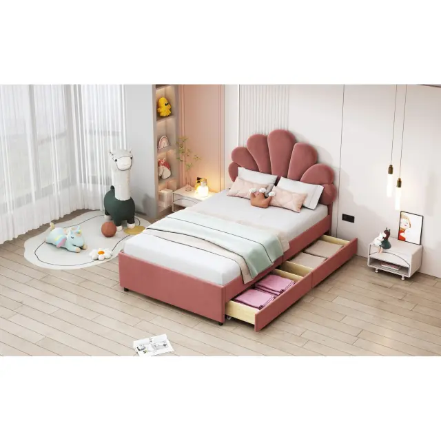 Otroška postelja z oblazinjenim žametom, roza, 90x200 cm, vzglavje s cvetličnim vzorcem, 2 predala za shranjevanje.