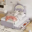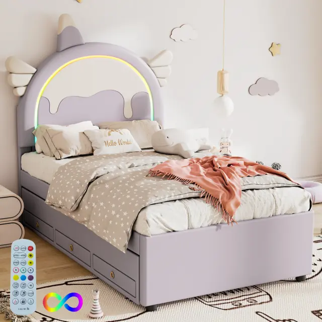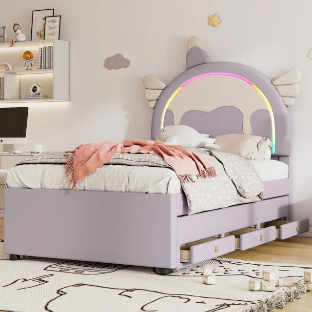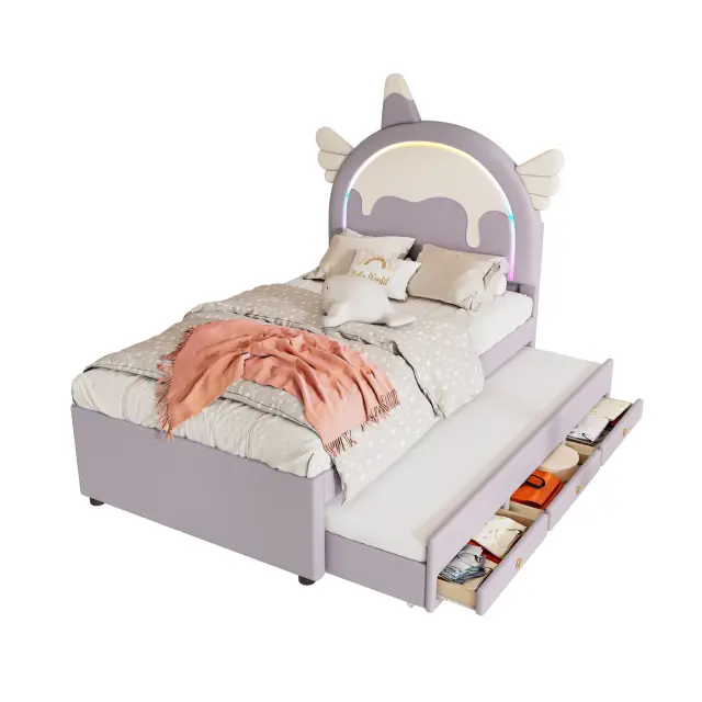 Otroška postelja z risanim samorogom in izvlečnim ležiščem, PU material, vijolična, 90x200 cm