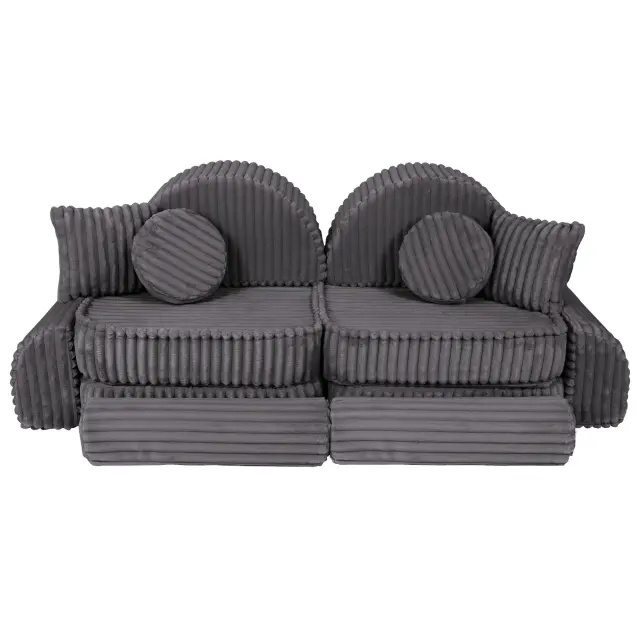 • Vsestranska modularna zasnova: Kavč je sestavljen iz 14 elementov, ki jih je mogoče razporediti na različne načine, vključno z obliko popolne postelje. Idealna rešitev za otroško sobo, igralni kotiček, bralni prostor ali popoldanski počitek.