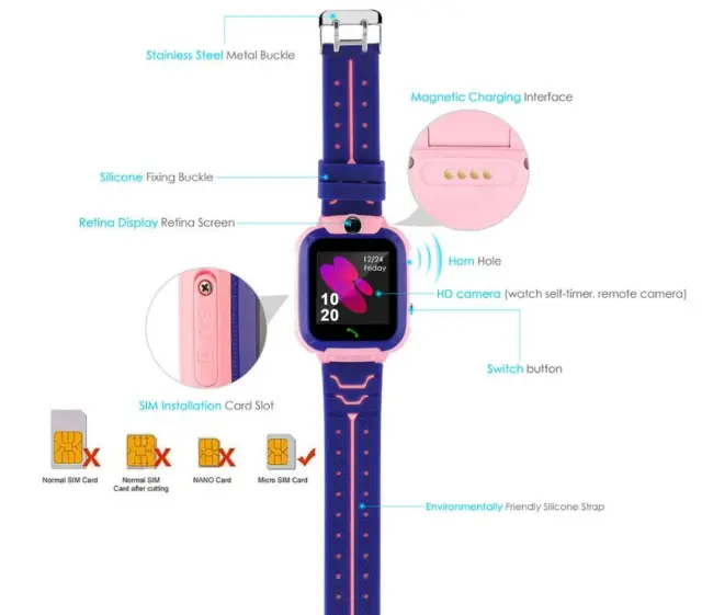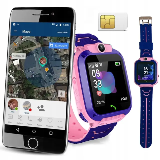Ura je opremljena z  GPS lokatorjem in Wifi modulom , zahvaljujoč kateremu lahko kadarkoli preverite, kje je vaš otrok. Aplikacija se samodejno poveže z Google maps, kjer ima skrbnik dostop do  zgodovine otrokove lokacije oziroma lahko preveri optimalen dostop do njega . Naprava ima tudi  funkcijo SOS  za nujne primere. Zahvaljujoč možnosti nastavitve SOS številke  vas lahko otrok neopazno obvesti, ko je v nevarnosti  – dovolj je, da pritisnete in držite SOS gumb. Ure  ni mogoče izklopiti, ko je na otrokovi roki , zato ste lahko prepričani, da povezava z njo ne bo prekinjena! Pametna ura za otroke odlično deluje z napravami, kot so pametni telefoni in tablice. Bluetooth vam bo omogočil delo z  Androidom (vsaj 2.3) in iOS  (z iOS morda niso združljive vse funkcije). Intuitivna aplikacija za prenos v telefon vam omogoča  preprosto in hitro upravljanje funkcij pametne ure,  kjer koli že ste. Pametna ura podpira standardne kartice microSIM,  tako da z zagonom in upravljanjem ne boste imeli težav! ZASLON NA DOTIK GPS lokator  omogoča sledenje lokaciji otroka Nastavitev varnega območja  za otroka. Vsak izstop izven cone sproži alarm na telefonu skrbnika. Gumb SOS  – v nujnem primeru samo pridržite SOS na pametni uri, da aktivirate alarm na telefonu skrbnika. Spremljanje spanja Alarm Svetilka Alarm za slabo baterijo Dohodni in odhodni klici Telefonski imenik z 10 številkami Možnost pošiljanja in prejemanja glasovnih in besedilnih sporočil Vgrajena izobraževalna igra Sistem srčnih nagrad , ki jih lahko skrbnik podeli otroku Možnost povezave dveh enakih pametnih ur  za vzpostavitev komunikacije Združljivost:  Android, iOS Kartica:  Micro SIM Zaslon:  barvni, na dotik Velikost zaslona:  1,44″ IPS HD Ločljivost zaslona : 128×128 Baterija:  400mAh Mehak plastični trak Čas pripravljenosti:  100 ur Čas polnjenja:  2 ure Tehnologija:  GPS GPS občutljivost  -159dBm Natančnost pozicioniranja  100m-1000m  MTK2503D 260MHZ procesor GSM/GPS  MT2503, BD2 Pomnilnik  32+32MB 3Mpx kamera Barva modra