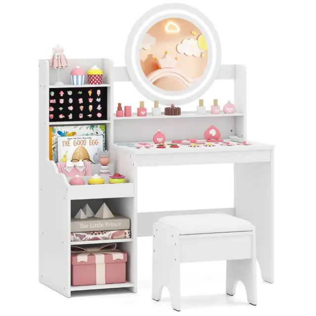 S tem kompletom otroške mizice za ličenje povečajte zabavo pri oblačenju! Ta toaletna mizica je opremljena z vgrajeno osvetlitvijo in zagotavlja optimalno osvetlitev za igro ličenja, pripravo na ličenje ali domišljijske dejavnosti. Premišljeno zasnovana otroška toaletna mizica ima 2 odprti polici, reže za prstane, 3 predale in dvonadstropno stransko omarico, ki otrokom pomaga ohranjati red. Dodatno varnost zagotavljata akrilno ogledalo, ki se ne razbije, in zaščita proti prevrnitvi.