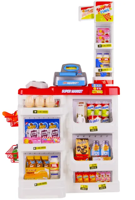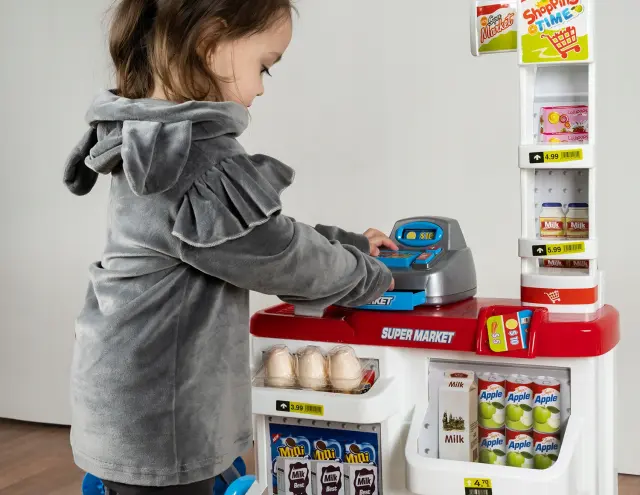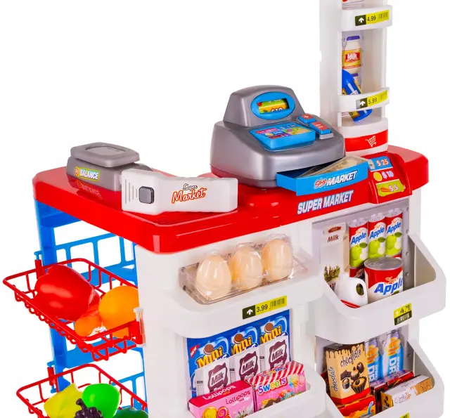 Igranje nakupovanja v supermarketu vas ne nauči le poznavanja posameznih izdelkov in uporabe plačilnih sredstev . Otroku omogoča tudi razumevanje pravil delovanja v družbi in spoznavanje družinskih obveznosti. Fantastičen igralni set za supermarket vsebuje blagajno, papir, igrače bankovcev, čitalnik črtne kode za izdelke, tehtnico in prodajni pult, različne izdelke na policah in policah ter voziček na kolesih .