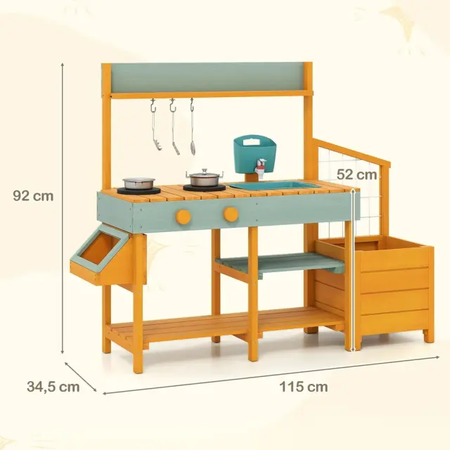 Ta lesena kuhinja ima kuhalnice z vrtljivimi gumbi in ponuja pristno izkušnjo, ki spodbuja otroško domišljijo in kulinarične spretnosti. Odstranljivi pomivalno korito, pipa in umivalnik zagotavljajo neskončno zabavo na prostem. Zaboj za sadike z rešetko spodbuja otroke k urejanju prostora in vrtnarjenju skozi igro. Ta blatna kuhinja, izdelana iz naravnega cedrovega lesa z gladkimi robovi in površinami, zagotavlja varno in veselo igro. Police in kavlji zagotavljajo veliko prostora za shranjevanje, da so kuhinjski pripomočki in druge igrače lepo urejeni. Ta zunanja otroška kuhinja je odlično darilo za otroke, stare od 3 do 8 let, in zagotavlja ure ustvarjalne igre in učne zabave.