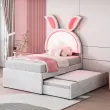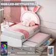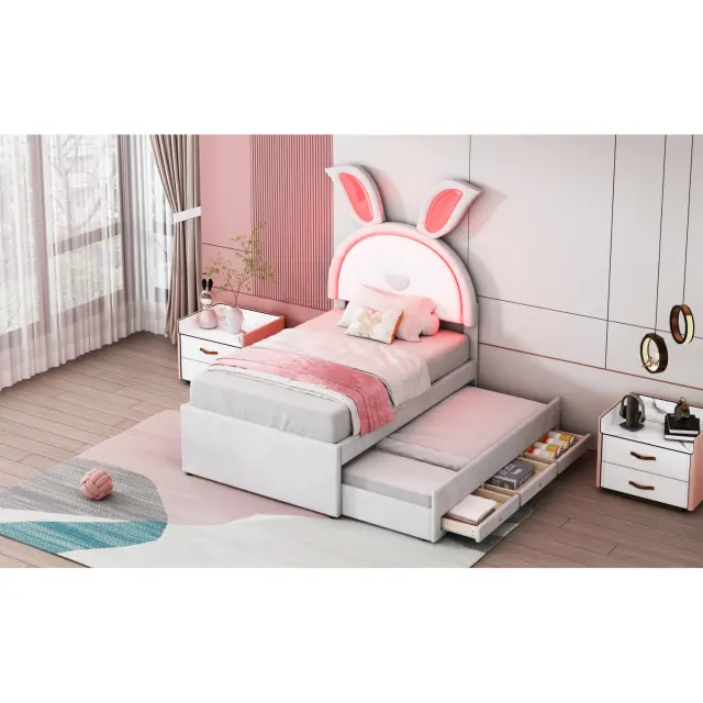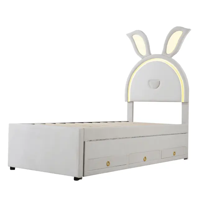 Otroška žametna oblazinjena postelja 90x200 cm, večnamenski enojni kavč z izvlečnim prostorom, shrambo in LED lučko, bež