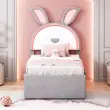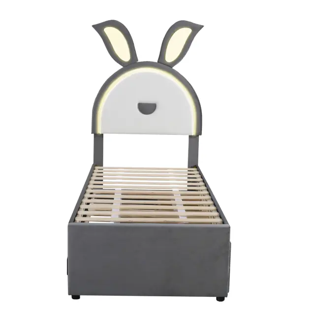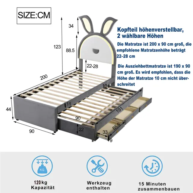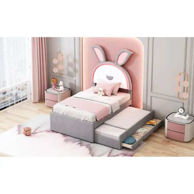 Otroška žametna oblazinjena postelja 90x200 cm z LED lučko, izvlečno posteljo in shrambo, siva