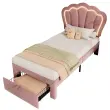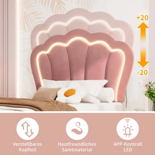 Otroška žametna roza LED postelja 90x200 cm s predali, upravljanjem prek aplikacije, nastavljivim vzglavjem
