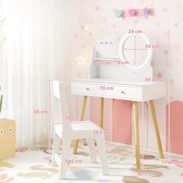 Z ogledalom za ličenje z osvetlitvijo LED: komplet otroške mizice za ličenje je opremljen z ogledalom in lučkami, ki bodo otroku popestrile domišljijsko igro. Na voljo sta dve barvni nastavitvi, med katerima lahko izbirate - bela in rumena. Opomba: Zahteva 3 baterije AA (niso vključene).
