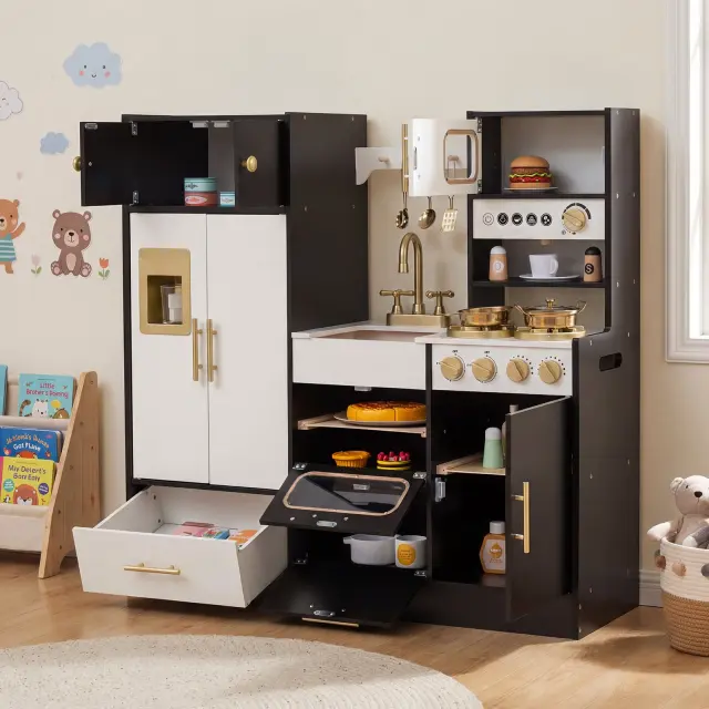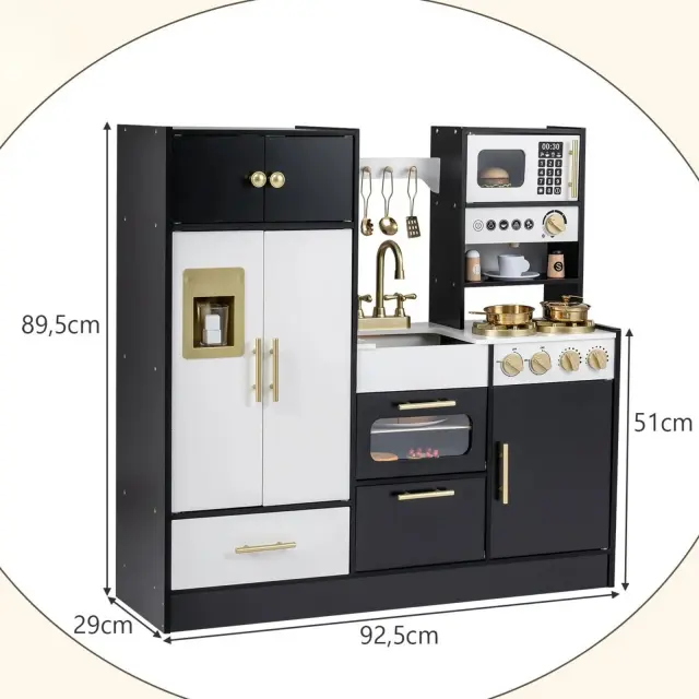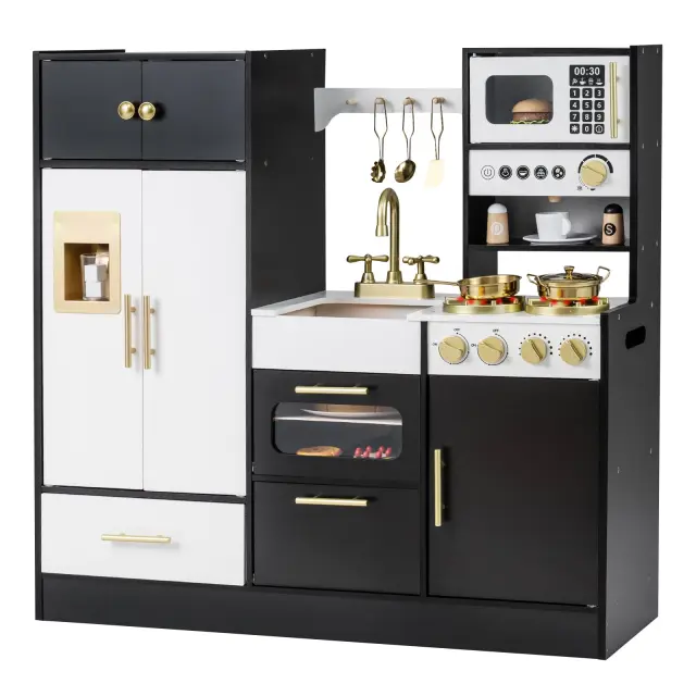 Ta igralna kuhinja ponuja zanimivo in realistično izkušnjo kuhanja z osvetljeno kuhalno ploščo, ki se oglaša s pravimi zvoki kuhanja. Klikanje gumbov spodbuja interaktivno igro, medtem ko aparat za pripravo sladoleda za dodatno zabavo razporedi navidezne ledene kocke. Mikrovalovna pečica, aparat za kavo in pečica otrokom omogočajo domišljeno pripravo jedi in pijač, medtem ko igralni umivalnik s pipo spodbuja igranje vlog pri kuhinjskih opravilih.