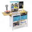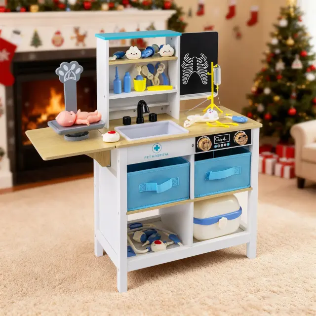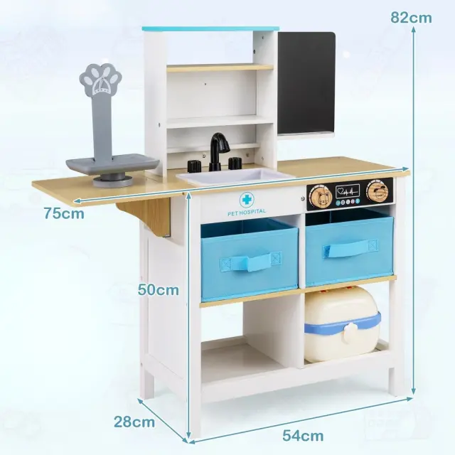 Ta zdravniški igralni set za otroke ustvarja poglobljeno in interaktivno zdravniško izkušnjo, ki je kot nalašč za domišljijsko igro vlog. S tablo za pisanje, zabavno lestvico z risanimi živalmi, realističnim umivalnikom s pipo in zadovoljivimi gumbi za klikanje spodbuja ustvarjalnost in praktično zabavo. Organizacijske funkcije, kot so odprte police, reže, predali iz blaga, predali in zložljiva mizica, olajšajo pospravljanje in spodbujajo ljubezen do reda. Leseni medicinski center je izdelan z mislijo na varnost in ima gladke robove, zaobljene vogale, komplet proti prevračanju in trdne noge za varno zabavo med igro.