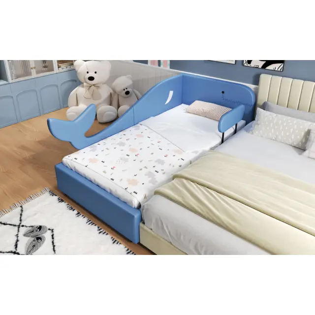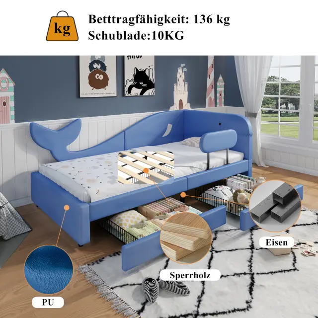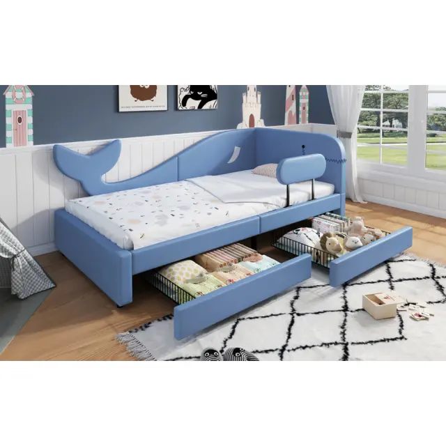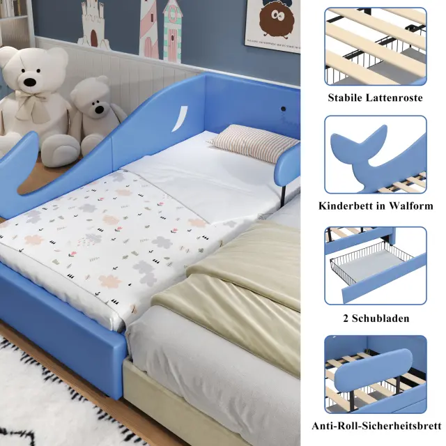 Otroški kavč v obliki kita z dvema predaloma, 90x200 cm, moder