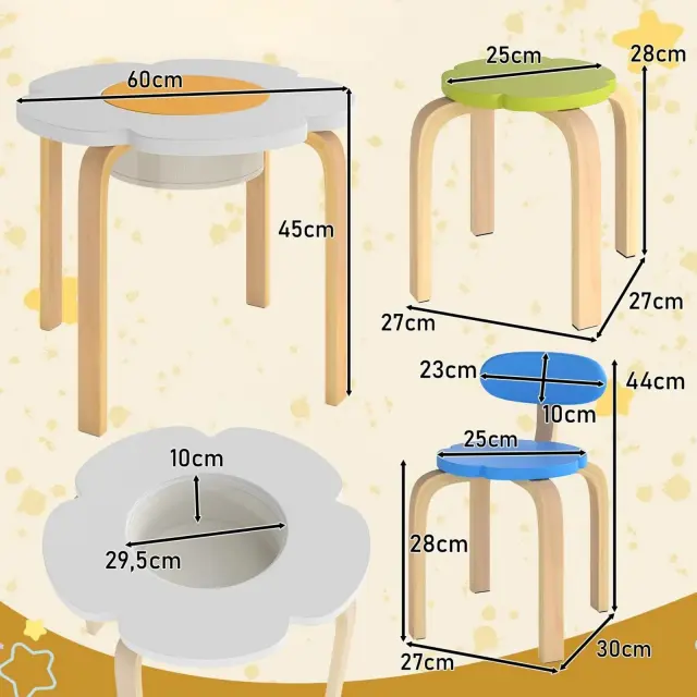 Simpatična otroška mizica v obliki rože je odličen dodatek za otroško sobo, igralnico ali jasli. Miza in stoli so trdna in varna delovna površina, na kateri lahko otroci ustvarjajo, izdelujejo in se učijo. V kompletu dveh stolov in dveh stolčkov lahko sedijo štirje otroci hkrati. Zaradi prikupnih oblik cvetov je v otroški sobi privlačen za oči. Skriti prostor za shranjevanje z varnim pokrovom poskrbi za urejenost igrač, obrtniških pripomočkov in knjig. Zaobljeni vogali in robovi brez razpok zagotavljajo varno uporabo. Nedrseče blazinice za noge povečujejo stabilnost in ščitijo tla pred praskami.