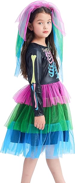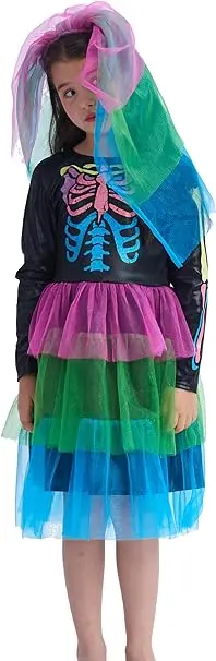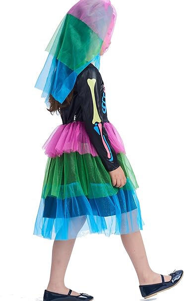 Barvit otroški kostum okostnjaka je zasnovan posebej za deklice v starosti od 3 do 4 let, ki želijo praznovati noč čarovnic v edinstvenem slogu. Obleka združuje tradicionalno estetiko praznika Día de los Muertos z nežnimi dekliškimi detajli, kar ustvarja vizualno privlačno in čarobno podobo. Izdelek je primeren za različne priložnosti, od vrtčevskih maškarad do tematskih rojstnodnevnih zabav, kjer otroku omogoča popolno vživetje v domišljijski svet. Zaradi premišljenega kroja in mehkih materialov je kostum praktična izbira za starše, ki iščejo kombinacijo estetike in funkcionalnosti.