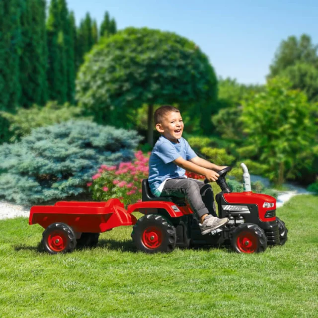 Otroški traktor na pedala je zelo dobro opremljen in pripravljen na spomladanska in poletna dela, manjka le mali kmet!