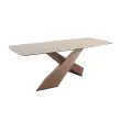 Ovalna jedilna miza sodaste oblike z modernim dizajnom in fiksnim pokrovom iz porcelanskega marmorja v barvi peska z mat finišem. Njene izvirne noge iz furnirja iz naravnega orehovega lesa so ključni elementi, ki izstopajo v njenem dizajnu.