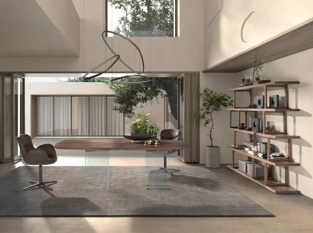 Ovalna jedilna miza v obliki soda sodobnega dizajna s fiksno ploščo iz naravnega orehovega furnirja. Njene originalne noge iz kaljenega stekla so ključni elementi, ki izstopajo v njenem dizajnu.