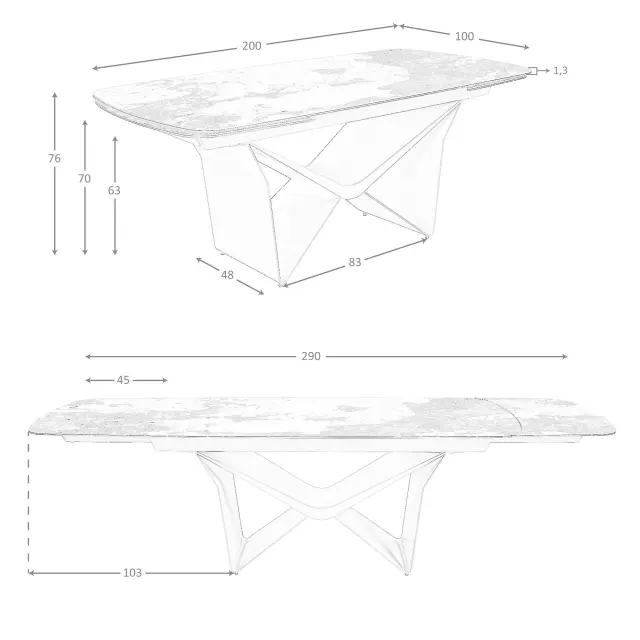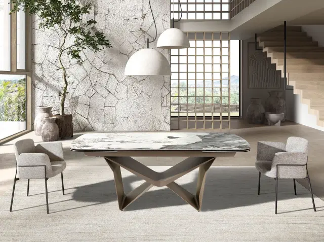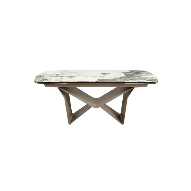 Ovalna raztegljiva jedilna miza s porcelanastim marmorjem in kovinskim jeklenim sodom v barvi taupe