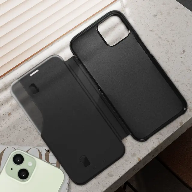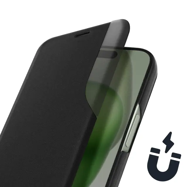 Ovitek Folio Clear View, zasnovan za vaš iPhone 15 Plus. Pokrov z majhnim prosojnim okencem za enostavno preverjanje časa brez odpiranja pokrova. Popolna zaščita z magnetno zaponko, ki je integrirana znotraj pokrova. Popolnoma uživajte v telefonu zahvaljujoč funkciji stojala.