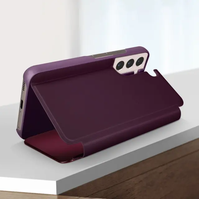 Ta modro vijolicen etui Clear View za Samsung Galaxy S22 je prakticen za vsak dan. Vecnamenska preklopna školjka, ki prikazuje obvestila in se lahko v stanju pripravljenosti spremeni v ogledalo. Lahko se uporablja tudi kot video podpora.