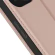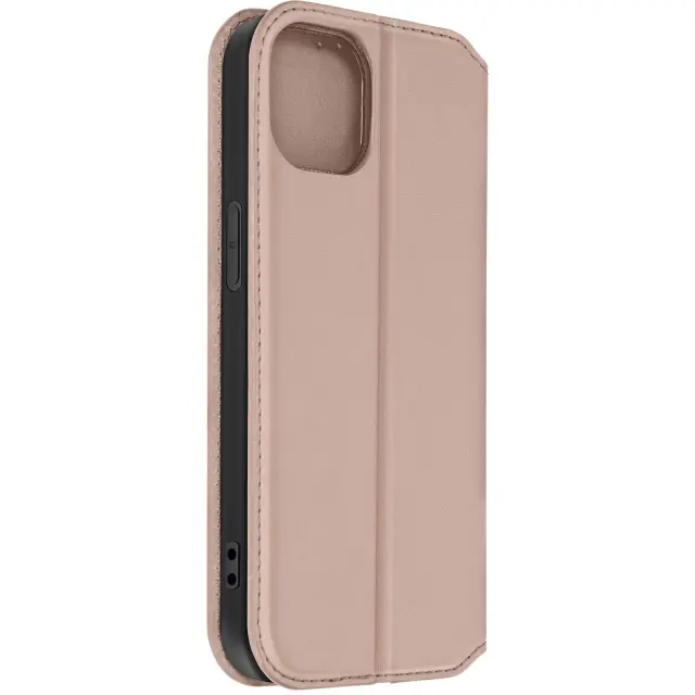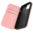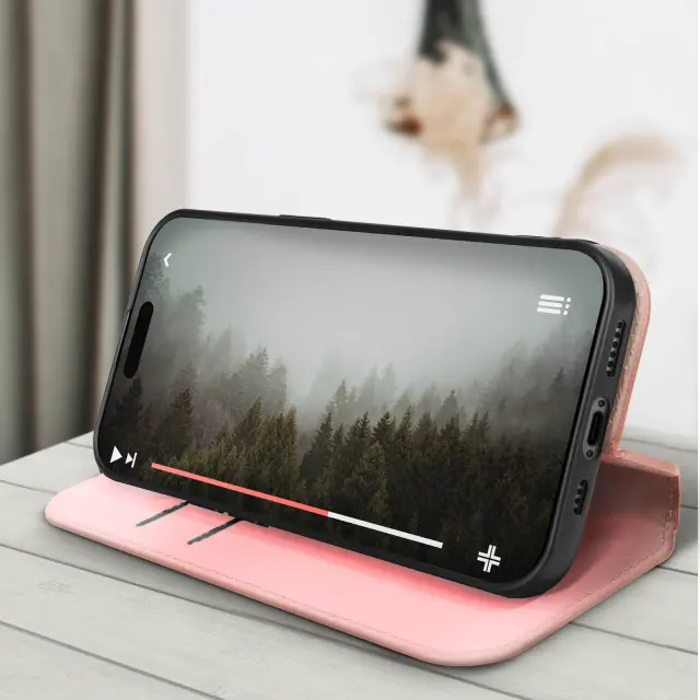 Roza folija za iPhone 15. Ima predelke za kartice v podlogi magnetne lopute in odporno in prožno silikonsko gelsko lupino. Služi tudi kot vodoravna podpora za ogled vaših videoposnetkov.
