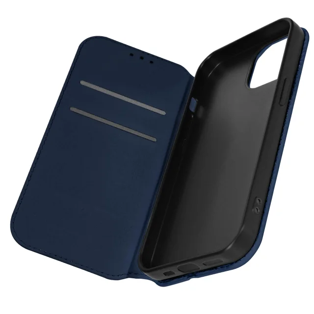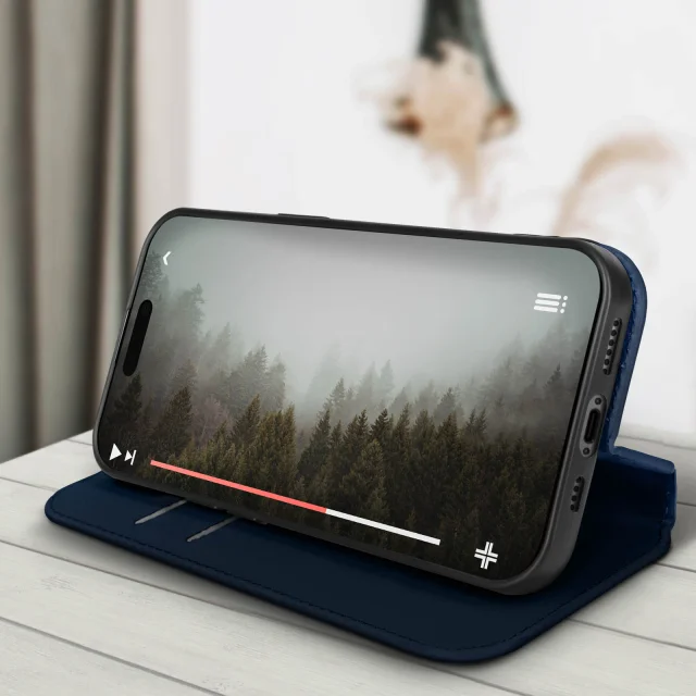 Ovitek Folio za iPhone 15 v polnocno modri barvi. Ima predelke za kartice v podlogi magnetne lopute in odporno in prožno silikonsko gelsko lupino. Služi tudi kot vodoravna podpora za ogled vaših videoposnetkov.