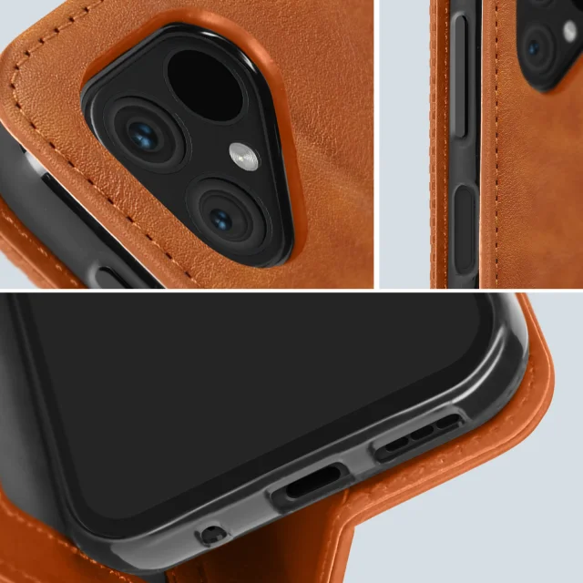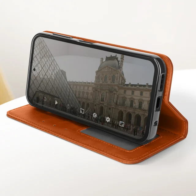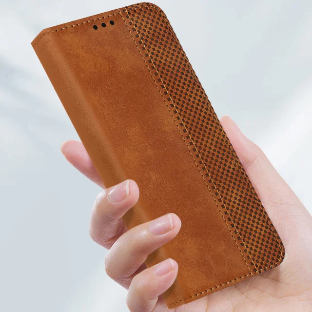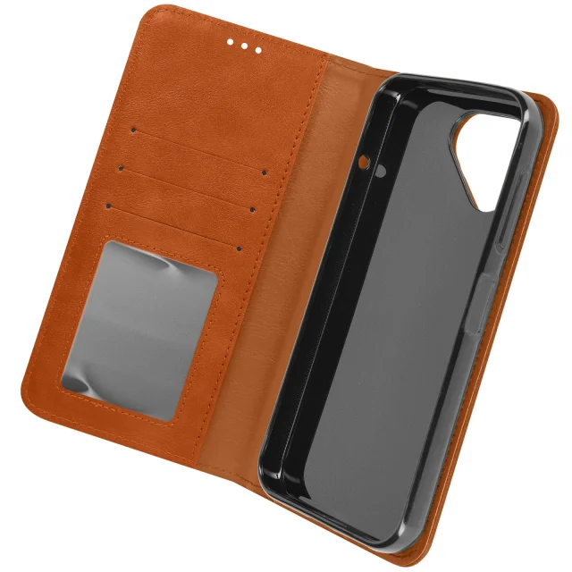 Zašcita Zbirka Fairphone 5 Geo, ki združuje zašcito in dizajn. Rjavi ovitek v imitaciji usnja Fairphone 5 z notranjim silikonskim ohišjem. Etui z vzorcem šahovnice z magnetno loputo. Zašcita s prevleko za denarnico in funkcijo video stojala.