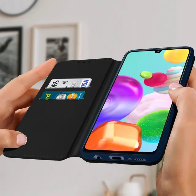Celoten zaščitni ovitek posebej izdelan za vaš Samsung Galaxy A41. Učinkovito ščiti vaš pametni telefon pred vsakodnevnimi udarci in praskami. Izkoristite namensko shrambo, ki je vgrajena v zavihek, da vstavite svoje kartice. Funkcija vodoravnega stojala za udobno uživanje v fotografijah in videoposnetkih.