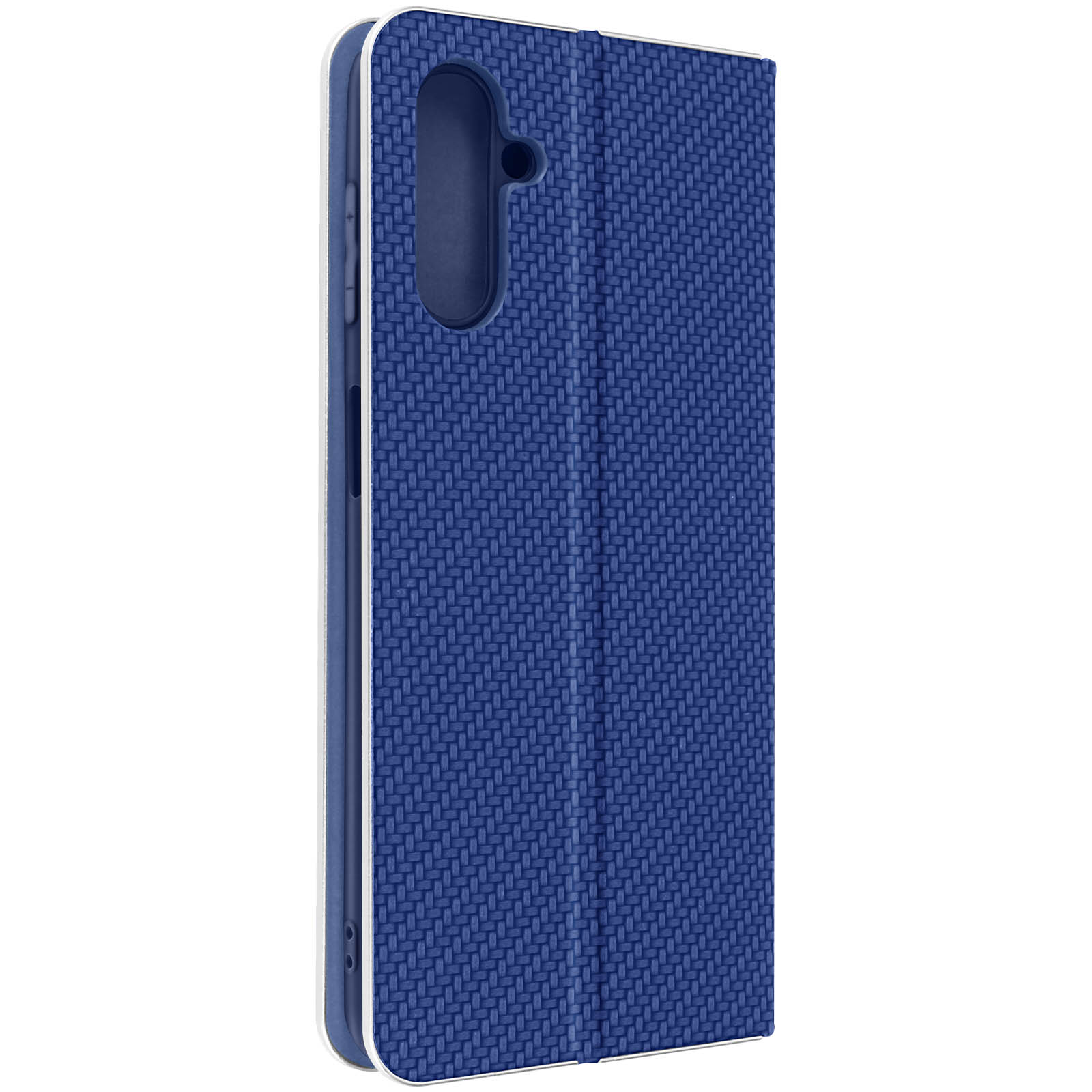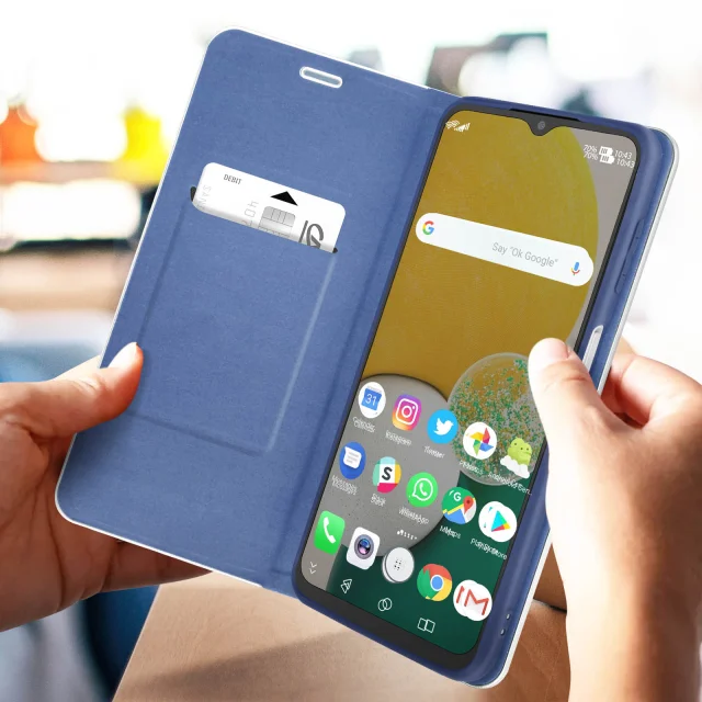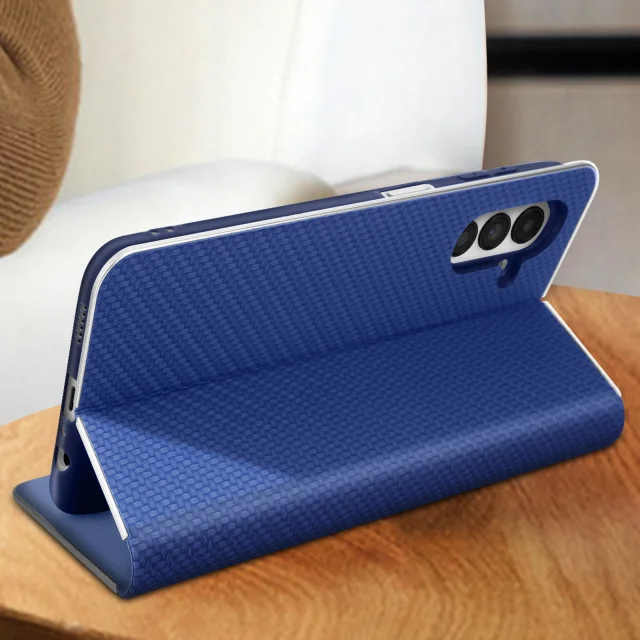 Ovitek za Samsung Galaxy A13 5G in Samsung Galaxy A04s iz kolekcije Luna Book Carbon, s srebrnim okvirjem, ki zagotavlja zašcito in dizajn. Etui s prakticno magnetno loputo, ki ima držalo za kartico in deluje kot podpora za video.