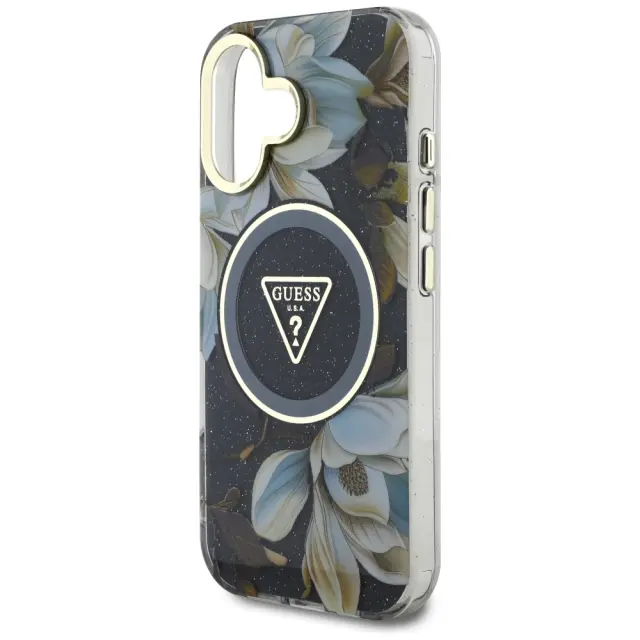OVITEK GUESS Z BLEŠČICAMI ROŽE TRIKOTNI GUMBI ZA IPHONE 16 ZA MAGSAFE