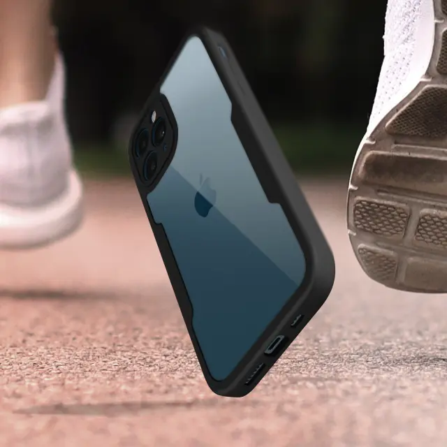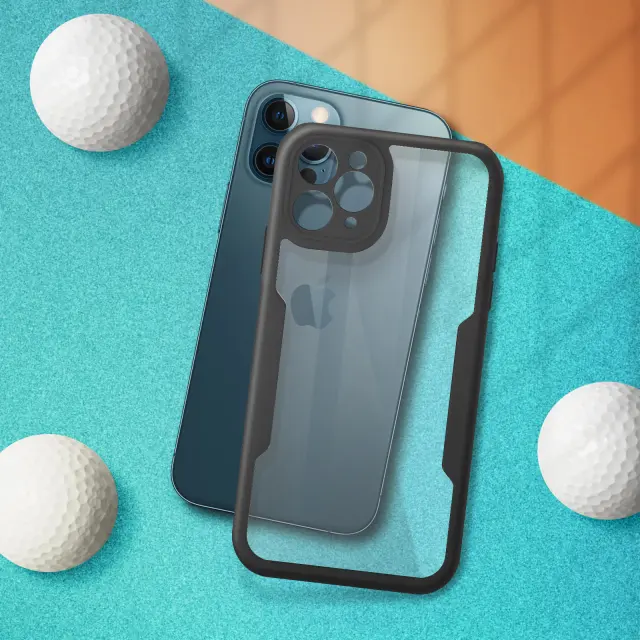 Ovitek za iPhone 12 Pro, odporen na udarce, s prozorno črno silikonsko konturo. Robustna hrbtna stran iz pleksi stekla poskrbi, da je zadnja stran vašega mobilnega telefona varna in brez ovir. Sprednji del iz polimera prekriva zaslon za zaščito. Vaš zaslon ohrani vse svoje lastnosti otipa in barvne reprodukcije.