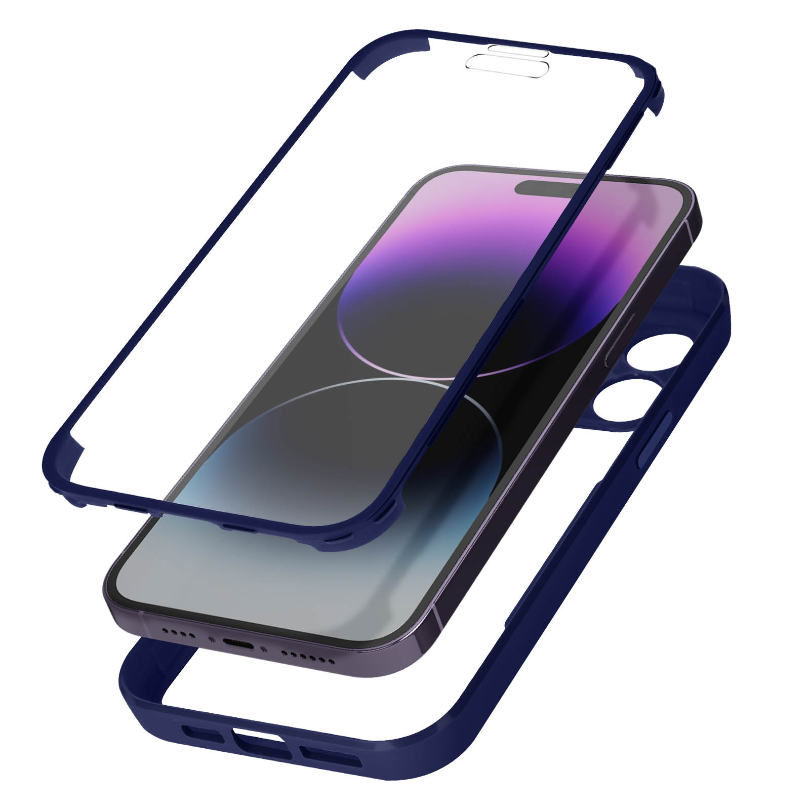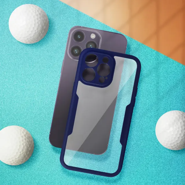 Celoten ovitek z iPhone 14 Pro. Sestavljen iz robustnega hrbtnega dela iz pleksi stekla in sprednjega dela iz polimera. Ojacani vogali. Dostopne funkcije in lastnosti zaslona v celoti ohranjene. Preoblikovani stranski gumbi.