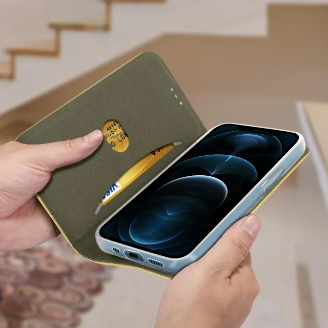 Ovitek iz blaga za iPhone 12 Pro Max z mehko notranjostjo in podporo za video, Sensitive Collection - zlata