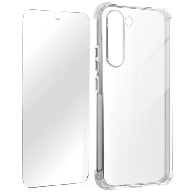 Vrhunski zašcitni paket Samsung Galaxy S23 popolnoma zašciti vaš pametni telefon. Ohišje z ojacanimi vogali, ki pušca vidno obliko mobilnega telefona. Film iz kaljenega stekla 9H, ki ohranja zacetne lastnosti zaslona.