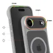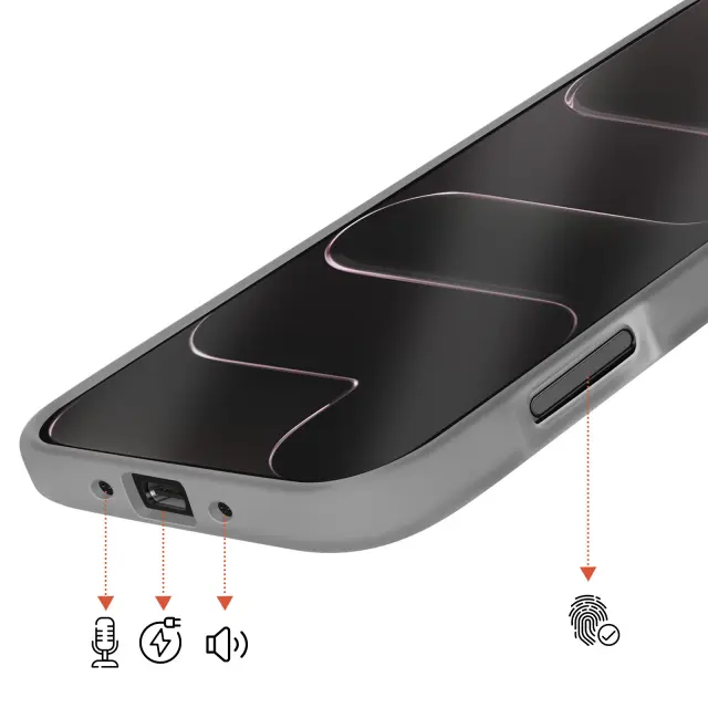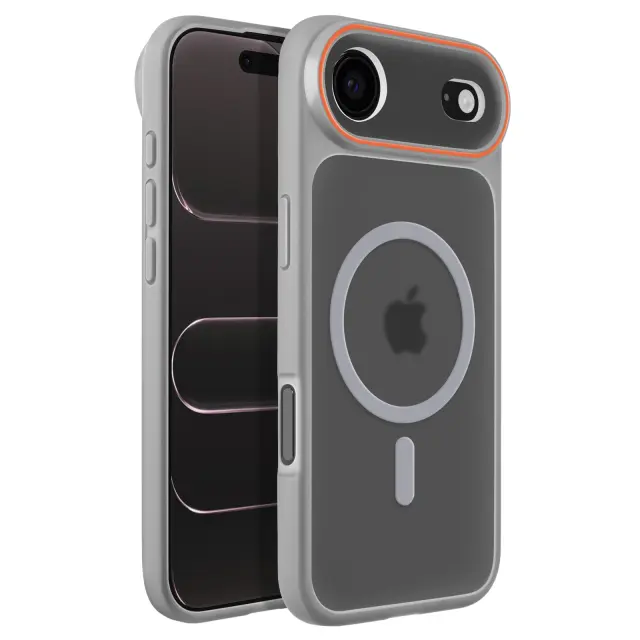 Vgrajen magnetni sistem za stabilno pritrditev polnilnikov in dodatne opreme MagSafe brez odstranjevanja ohišja. Trdna polikarbonatna hrbtna stran v kombinaciji s poltrdnim silikonskim okvirjem za učinkovito zaščito pred udarci. Za 2 mm povišan sprednji rob in dodatna debelina okoli enote kamere za zmanjšanje nevarnosti prask in udarcev. Elegantna mat obdelava zmanjšuje količino prstnih odtisov, hkrati pa ohranja diskretno, sodobno obliko.