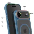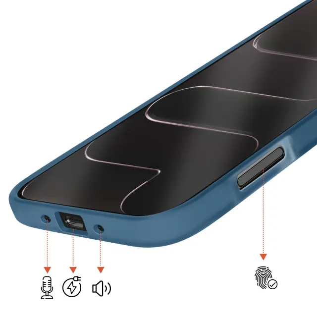 Vgrajen magnetni sistem za stabilno pritrditev polnilnikov in dodatne opreme MagSafe brez odstranjevanja ohišja. Trdna polikarbonatna hrbtna stran v kombinaciji s poltrdnim silikonskim okvirjem za učinkovito zaščito pred udarci. Za 2 mm povišan sprednji rob in dodatna debelina okoli enote kamere za zmanjšanje nevarnosti prask in udarcev. Elegantna mat obdelava zmanjšuje količino prstnih odtisov, hkrati pa ohranja diskretno, sodobno obliko.