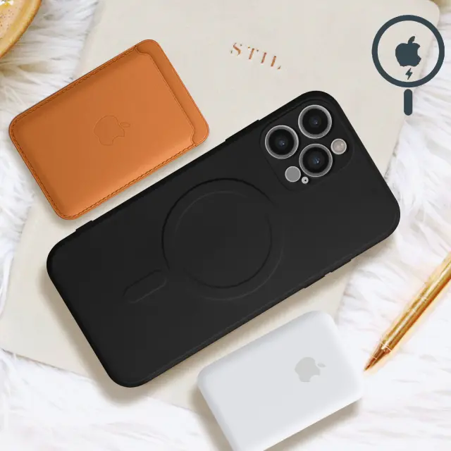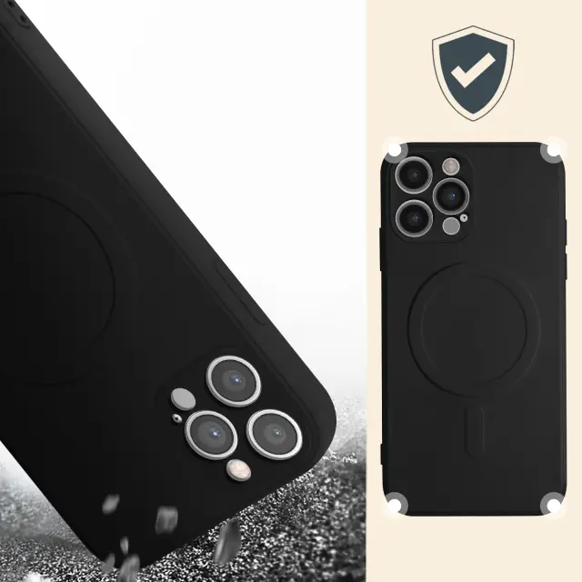 Crn Magsafe ovitek za iPhone 12 Pro, Mag Cover. Pritrdi se na dodatke Magsafe: podpora, polnilec, držalo za kartico. Izdelan iz silikona, absorbira udarce. Dvigne konturo zaslona in ovije blok kamere.