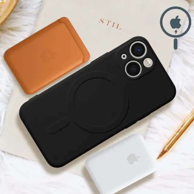 Crn Magsafe ovitek za iPhone 13, Mag Cover. Pritrdi se na dodatke Magsafe: podpora, polnilec, držalo za kartico. Izdelan iz silikona, absorbira udarce. Dvigne konturo zaslona in ovije blok kamere.