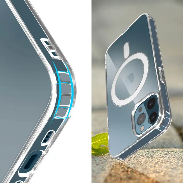 Ovitek Magsafe, zasnovan za vaš iPhone 12 Pro Max. Zahvaljujoč magnetnemu krogu se odlično poveže z dodatki Magsafe: stojala, polnilci, držalo za kartice... Prozoren, ščiti in hkrati ohranja dizajn vašega telefona. Hrbtna stran iz trdega polikarbonata in silikonska kontura za večjo odpornost.