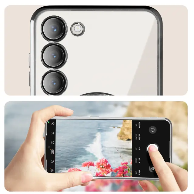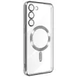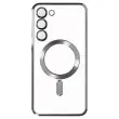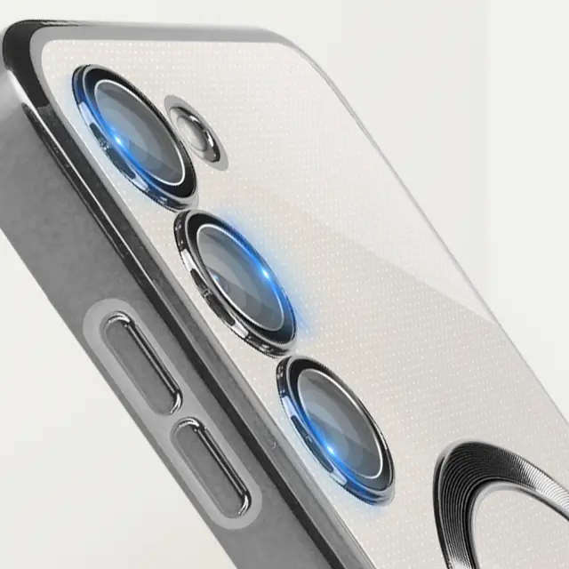 Ovitek MagSafe, zasnovan za Samsung S23 z magnetnim obrocem, za polnjenje vašega pametnega telefona s polnilniki MagSafe. Opremljen z vgrajeno zašcitno folijo za lece, doda pridih elegance s prozorno zadnjo stranjo in kromiranim obrisom.