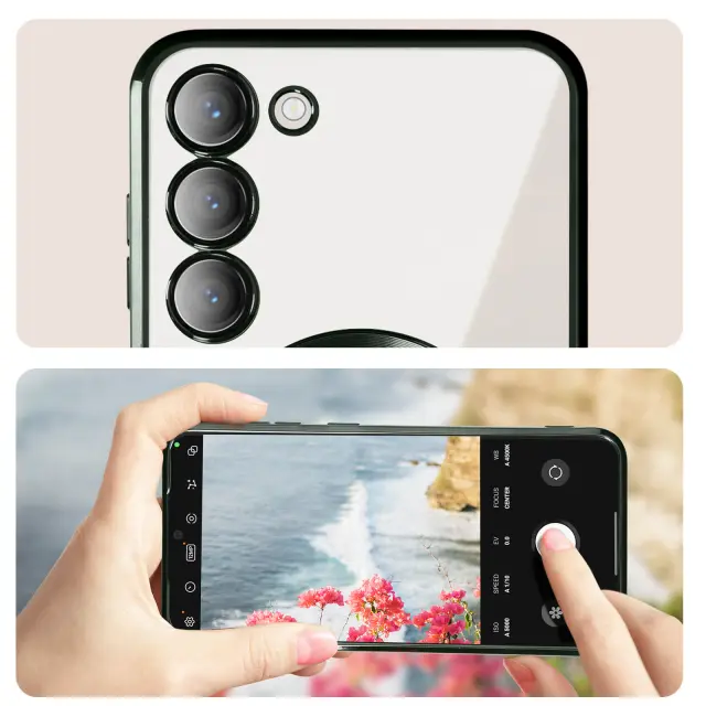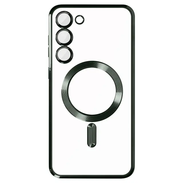 Ovitek MagSafe, zasnovan za Samsung S23 z magnetnim obrocem, za polnjenje vašega pametnega telefona s polnilniki MagSafe. Opremljen z vgrajeno zašcitno folijo za lece, doda pridih elegance s prozorno zadnjo stranjo in kromiranim obrisom.
