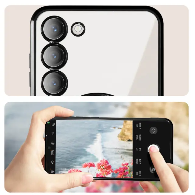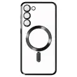 Ovitek MagSafe, zasnovan za Samsung S23 z magnetnim obrocem, za polnjenje vašega pametnega telefona s polnilniki MagSafe. Opremljen z vgrajeno zašcitno folijo za lece, doda pridih elegance s prozorno zadnjo stranjo in kromiranim obrisom.