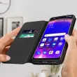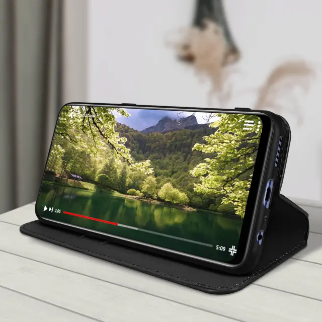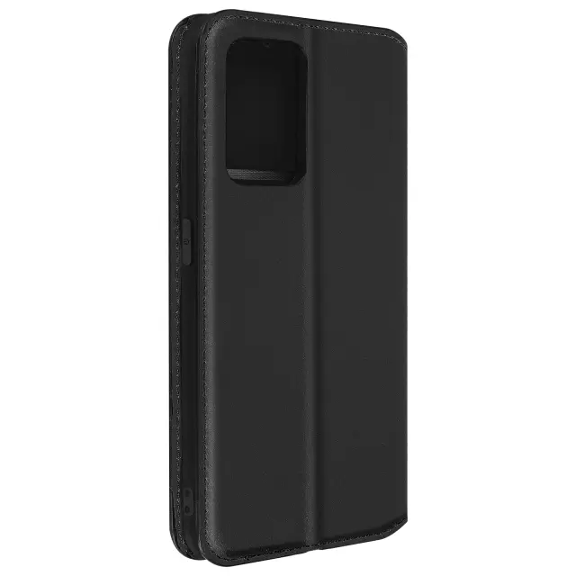 Ovitek Oppo Find X5 lite crn. Ta etui ima reže za kartice v preklopni podlogi in trdno, prožno silikonsko gelno ohišje. Deluje tudi kot vodoravna podpora za ogled vaših videoposnetkov.