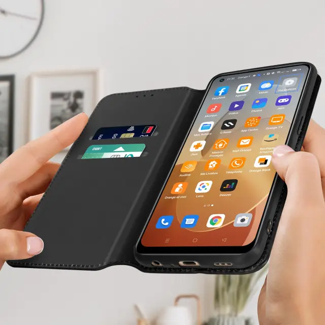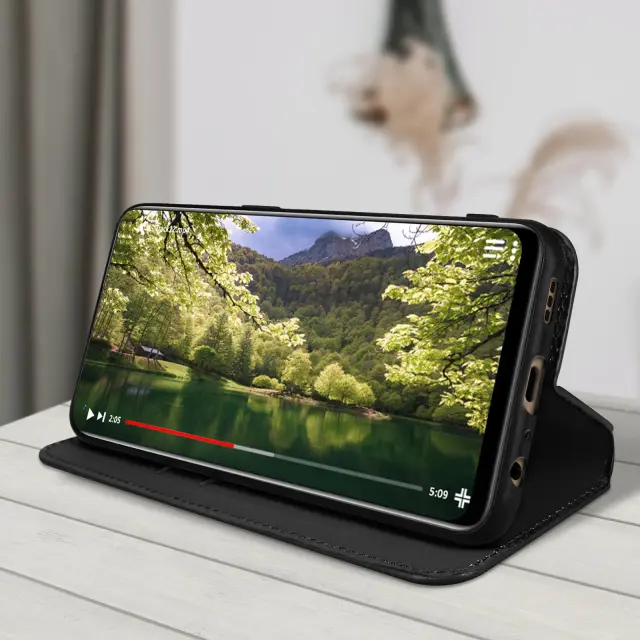 Ovitek Oppo Reno 7 z magnetnim preklopom, držalom za kartice in video držalom - crn