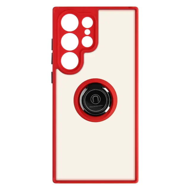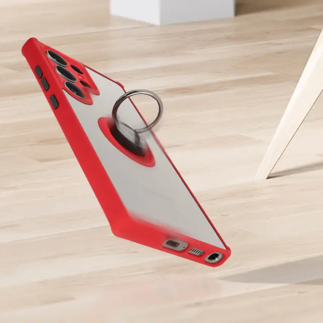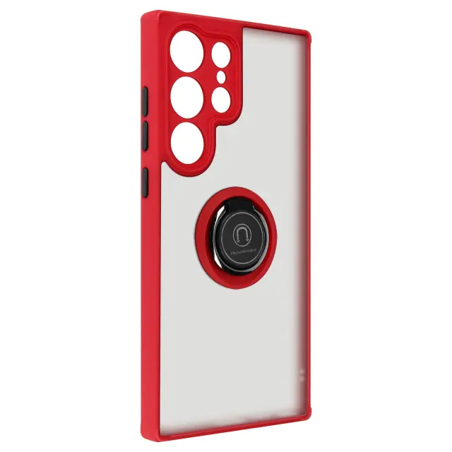 Rdeca dvomaterialna torbica za Samsung Galaxy S23 Ultra, šciti vaš telefon pred udarci in praskami. Zašcita z zadrževalnim obrocem, ki se lahko uporablja kot video nosilec in združljiv z magnetnim nosilcem (ni vkljucen). Mat zakljucek proti prstnim odtisom.