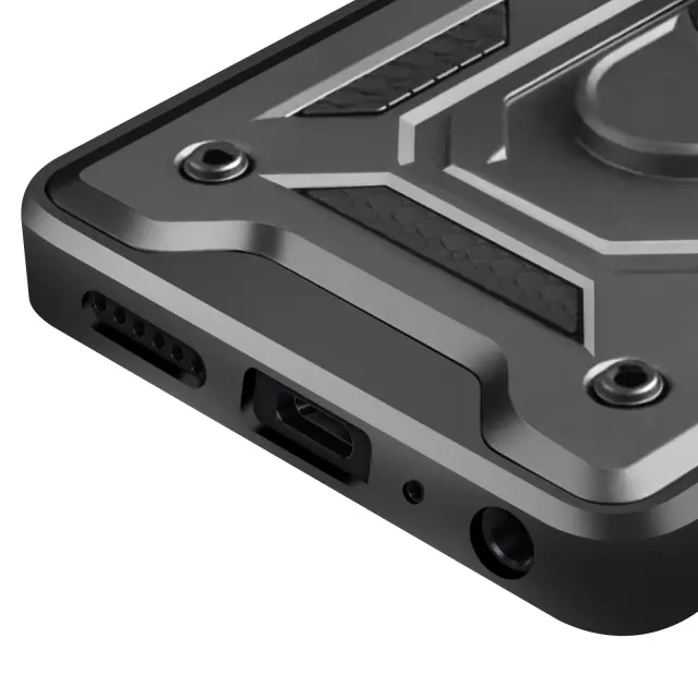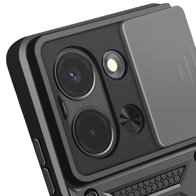 Zaščitite fotoaparat z drsnim pokrovom, ki preprečuje praske in zagotavlja zasebnost. Izkoristite vgrajeno podporo zaradi kovinskega obroča, ki se spremeni v praktično stojalo. Povečajte vzdržljivost z dvojnim materialom, ki združuje mehak silikon in tog polikarbonat.. Zagotovite vojaško odpornost z ojačenimi vogali, skladnimi z MIL-STD 810G.