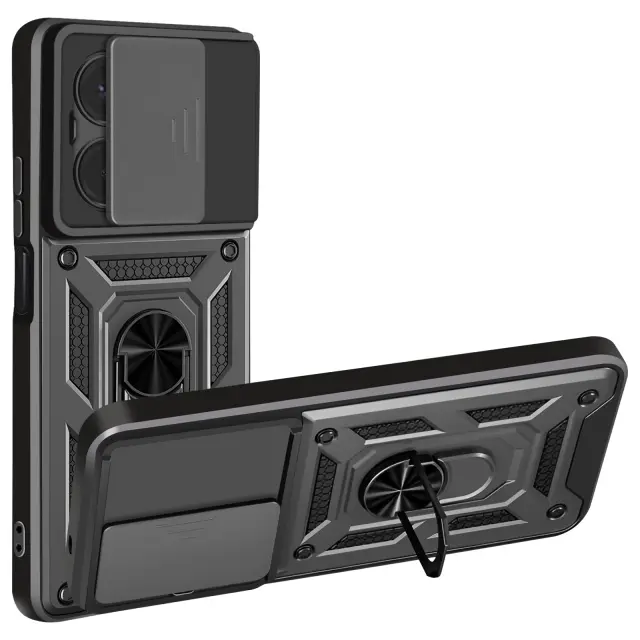 Ovitek Redmi 15C, odporen na udarce, z drsnim pokrovom kamere, kovinskim obročem in stojalom, Črna