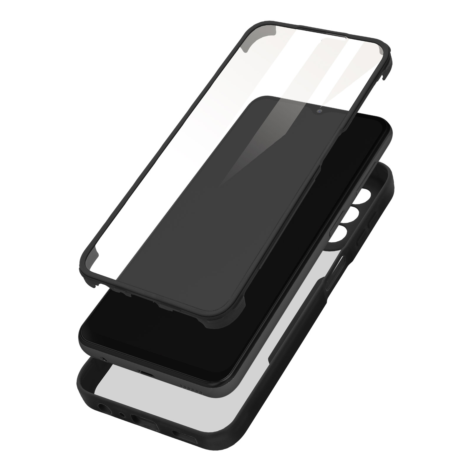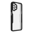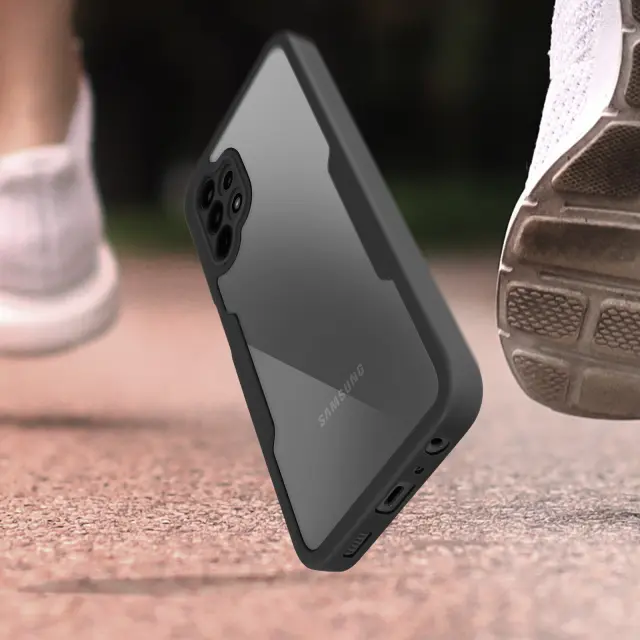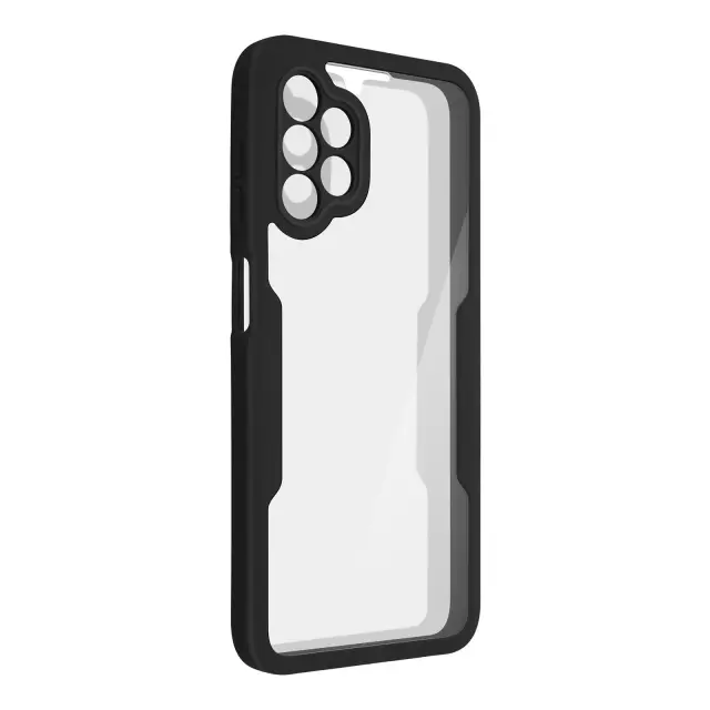 Ovitek za Samsung Galaxy A13, odporen na udarce, s prozorno črno silikonsko konturo. Robustna hrbtna stran iz pleksi stekla poskrbi, da je zadnja stran vašega mobilnega telefona varna in brez ovir. Sprednji del iz polimera prekriva zaslon za zaščito. Vaš zaslon ohrani vse svoje lastnosti otipa in barvne reprodukcije.