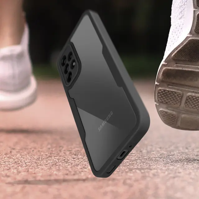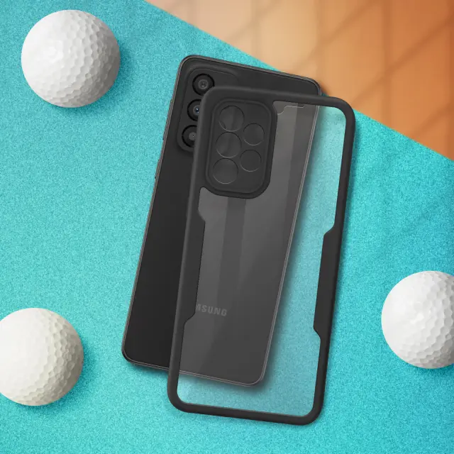 Ovitek za Samsung Galaxy A33 5G, odporen na udarce, s prozorno črno silikonsko konturo. Robustna hrbtna stran iz pleksi stekla poskrbi, da je zadnja stran vašega mobilnega telefona varna in brez ovir. Sprednji del iz polimera prekriva zaslon za zaščito. Vaš zaslon ohrani vse svoje lastnosti otipa in barvne reprodukcije.