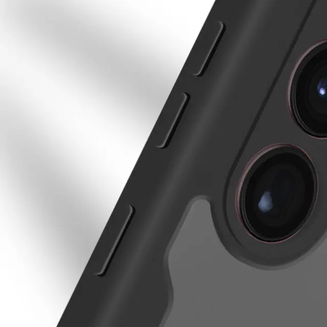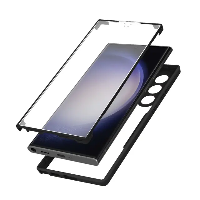 Celoten ovitek z Samsung S23 Ultra. Sestavljen iz robustnega hrbtnega dela iz pleksi stekla in sprednjega dela iz polimera. Ojacani vogali. Dostopne funkcije in lastnosti zaslona v celoti ohranjene. Preoblikovani stranski gumbi.